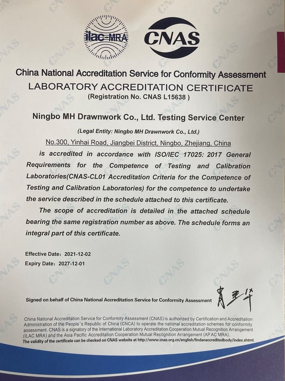 近日,寧波萌恒抽紗有限公司檢測服務(wù)中心正式獲得中國合格評定國家認(rèn)可委員會(huì)(CNAS)資質(zhì)認(rèn)可。