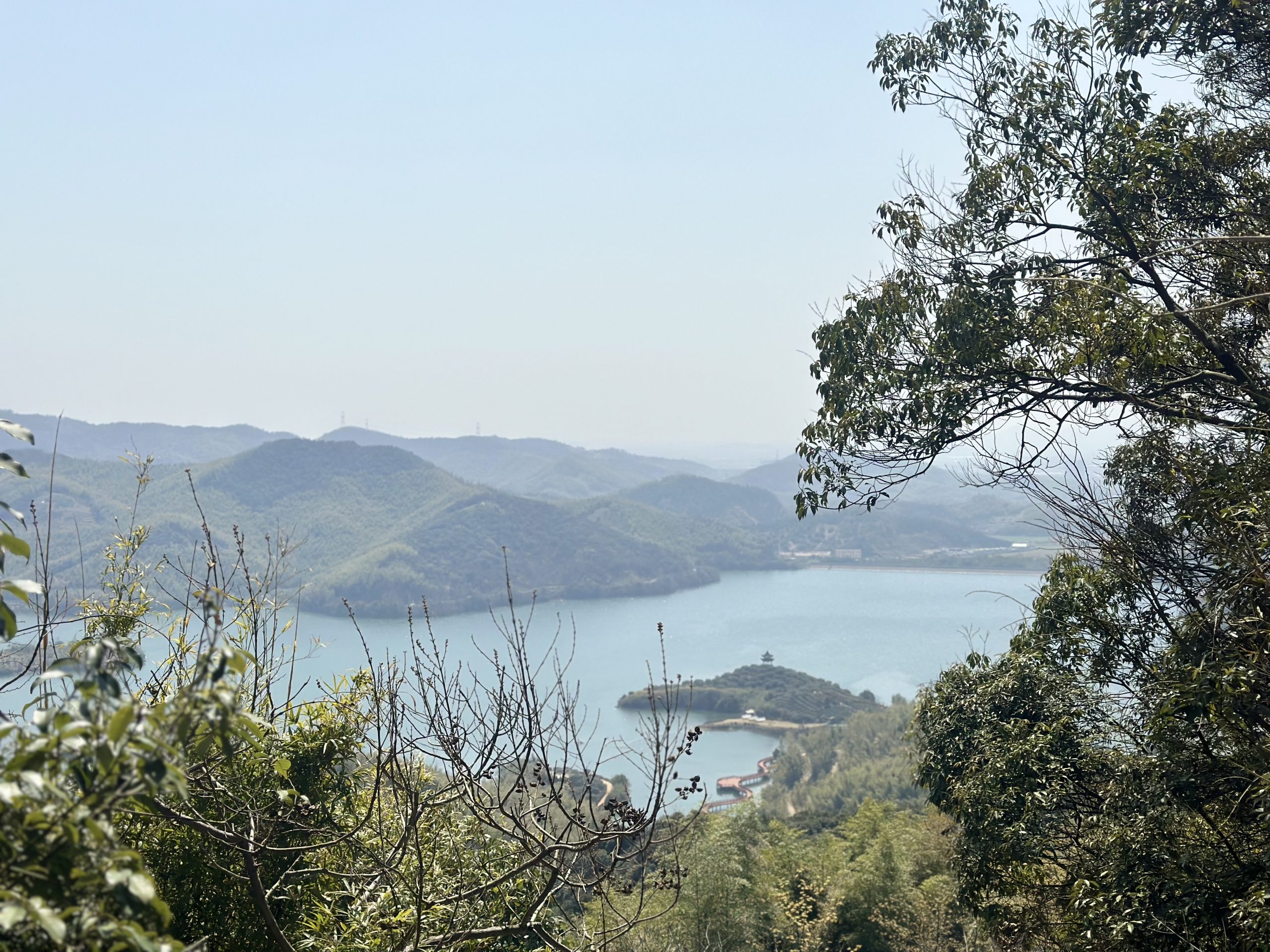 以南聯村的一條小路為起點,大家排成一路縱隊,緩緩前進。翻過一個小山坡,我們便來到了此次徒步的一段難點區域——一條直達山頂的石階。經過這幾年戶外徒步的鍛煉,絕大多數伙伴能跟上教練的登山節奏,但石階還是有一些坡度,一開始爬得太快,身體總是有些吃不消,中途就需要喘口氣歇歇,漸漸地隊伍就拉開了。大部隊在前方等待,落隊的人也從未萌生退意。負責墊后的小組由經驗豐富的徒步教練和體力充沛的事業部成員組成,有人主動接過體力不支的成員身上的負重,有人一旁鼓勵,有人默默陪伴,直到可以重新出發。一路上雖然艱難,但坐在石階上回頭看向身后的美景,群山與湖水,也默默治愈著疲憊的身心。