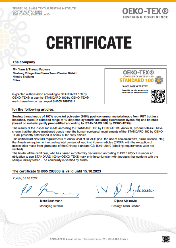 再生滌綸縫紉線通過生態(tài)紡織品標準認證